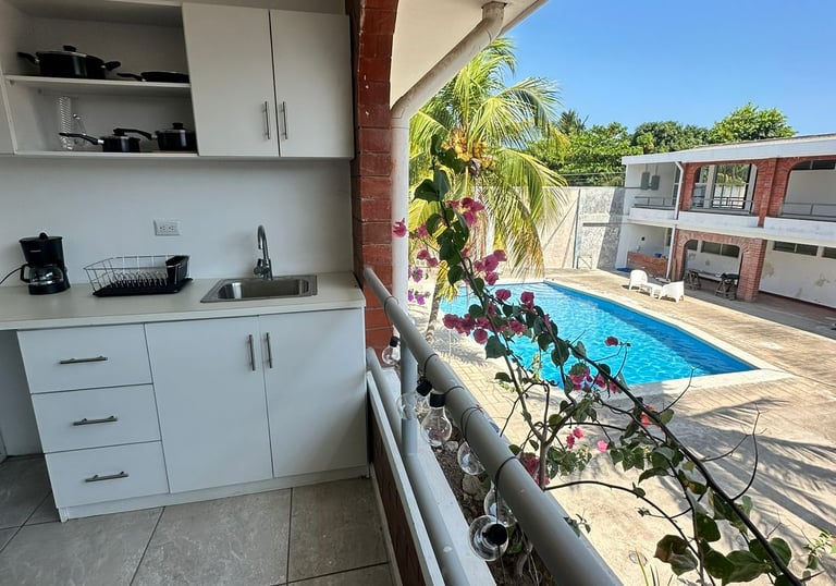 Lindos y amplios apartamentos. Linda vista del balcón a la piscina / gorgeous and spacious apartments. Nice balcony view to the pool.